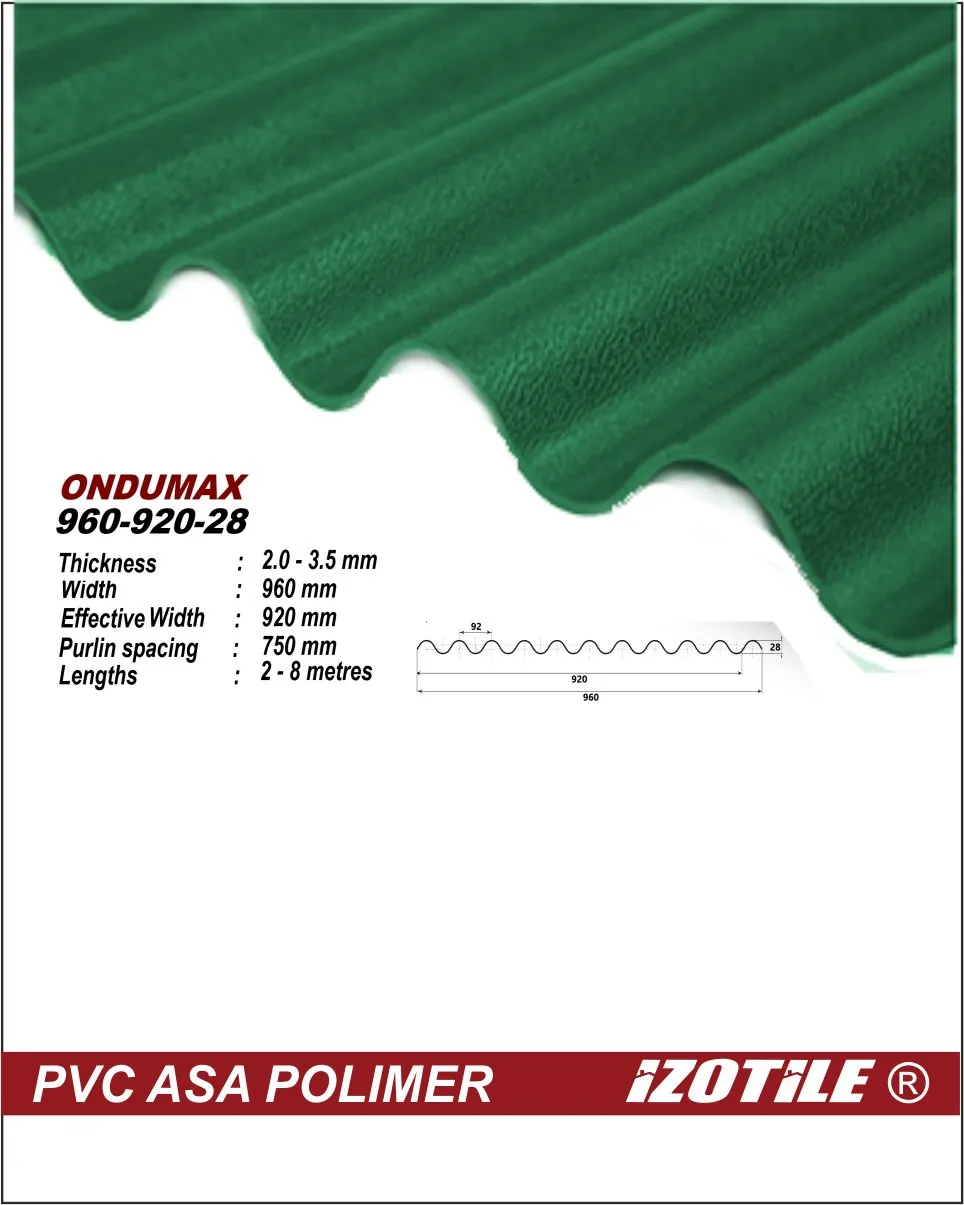 Izolare termică: Plăcile de acoperiș UPVC cu acoperire ASA, produse prin tehnica de coextrudare multi-strat, sunt remarcabile pentru proprietățile lor superioare de izolare termică și fonică în comparație cu produsele convenționale de acoperiș. Conductivitatea termică a acestor plăci este de 1/3 din cea a țiglei ceramice, 1/5 din cea a țiglei de beton cu o grosime de 10 mm și 1/2000 din cea a plăcilor de acoperiș metalice cu acoperire colorată.